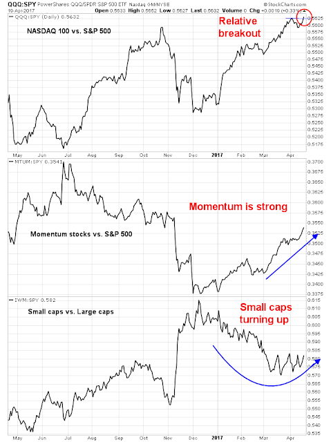 Style is different than post election. Momentum is leading whereas Value led post the election. My guess is that momentum is now comprised of Trump favorites that have outperformed for the last 5 months. When they started to lead from last week’s low, Momentum followed and led. Back in November when Value led, it was comprised of things like banks, industrials and other Clinton down trodden sectors that celebrated the Trump victory. Today Value is likely comprised of utility and staples that are cheap but out of favor.