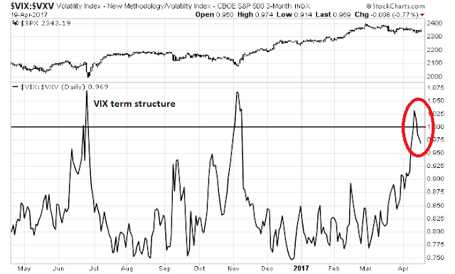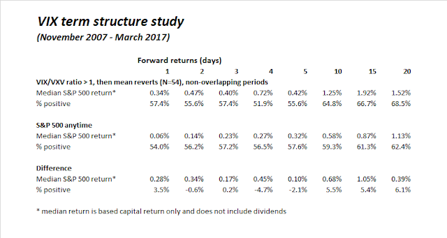 Consider, for example, the VIX/VXV ratio as a measure of the VIX term structure. When this ratio rises above 1, that is an inverted term structure indicating market fear. As the chart below shows, the VIX/VXV ratio inverted last week and returned to a normal upward sloping curve on Monday.