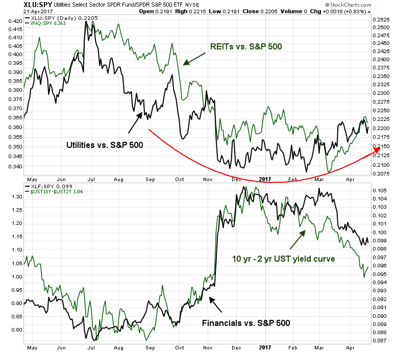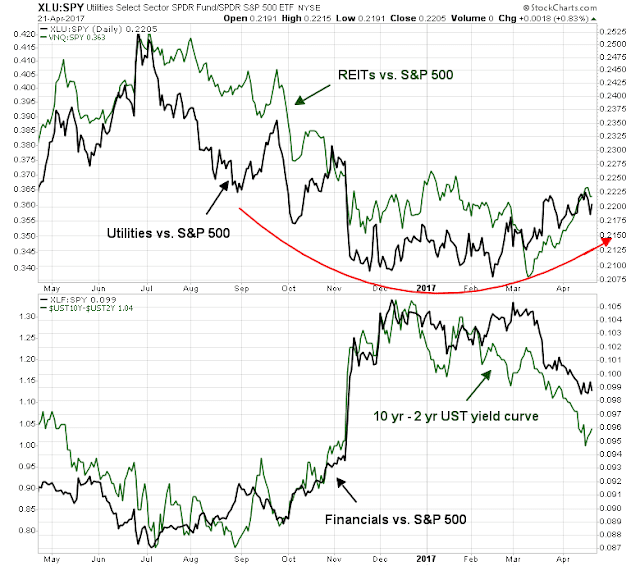 Here is a more detailed look at sectors, starting with the relative performance of the interest sensitive groups. The top panel below shows the relative returns of Utilities and REITs against the market. As the chart shows, these sectors are tracing out a rounding bottom relative to the market. The bottom panel shows the relative returns of Financials compared to the market. There has been much discussion in the blogosphere and social media about these stocks. As the chart shows, their relative returns have been highly correlated to the shape of the yield curve. A flattening yield curve has been detrimental to relative strength of Financial stocks.