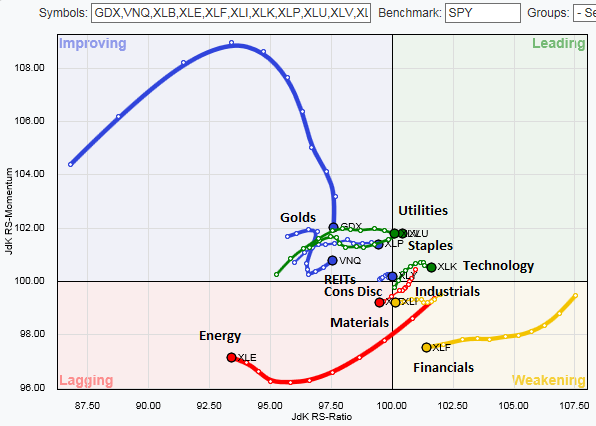 One of the tools of any sector review is the Relative Rotation Graph (RRG, click link for full explanation), Market leaders tend to rotate in a clockwise direction in an RRG chart, from lagging (bottom left), to improving (top left), to leading (top right), to weakening (bottom right), and then finally reverting to lagging again.