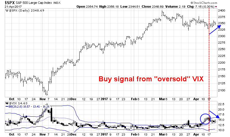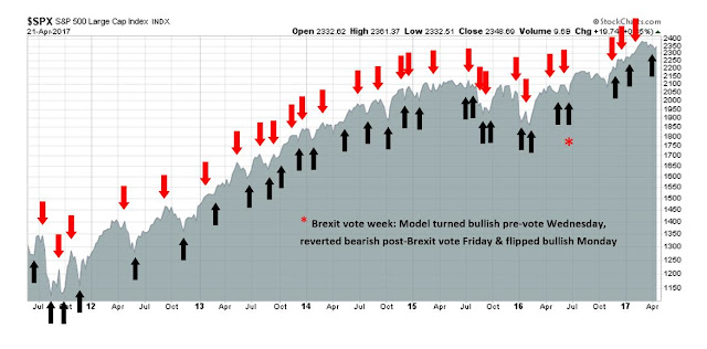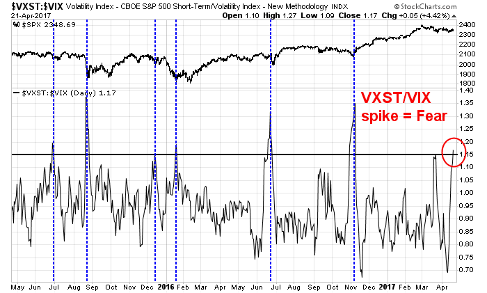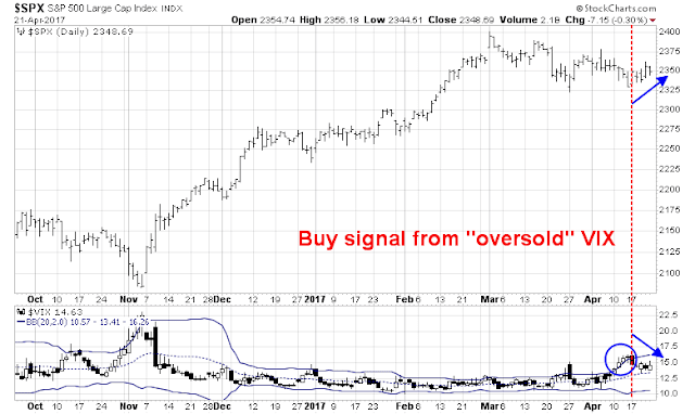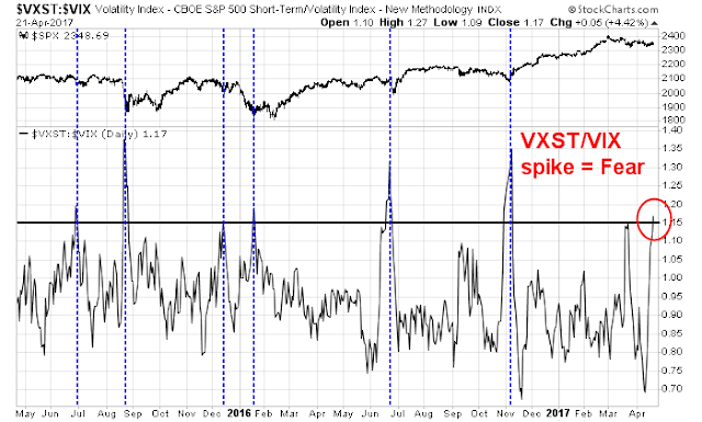 Past buy signals where an indicator has become oversold and mean reverted to neutral has resulted in powerful bullish thrust. The current episode is unusual as the bullish follow through has not materialized. The VXST/VIX spike is probably indicative of rising fear over the French election, whose first round is occurring this weekend.