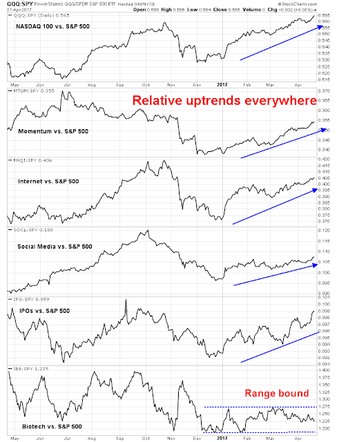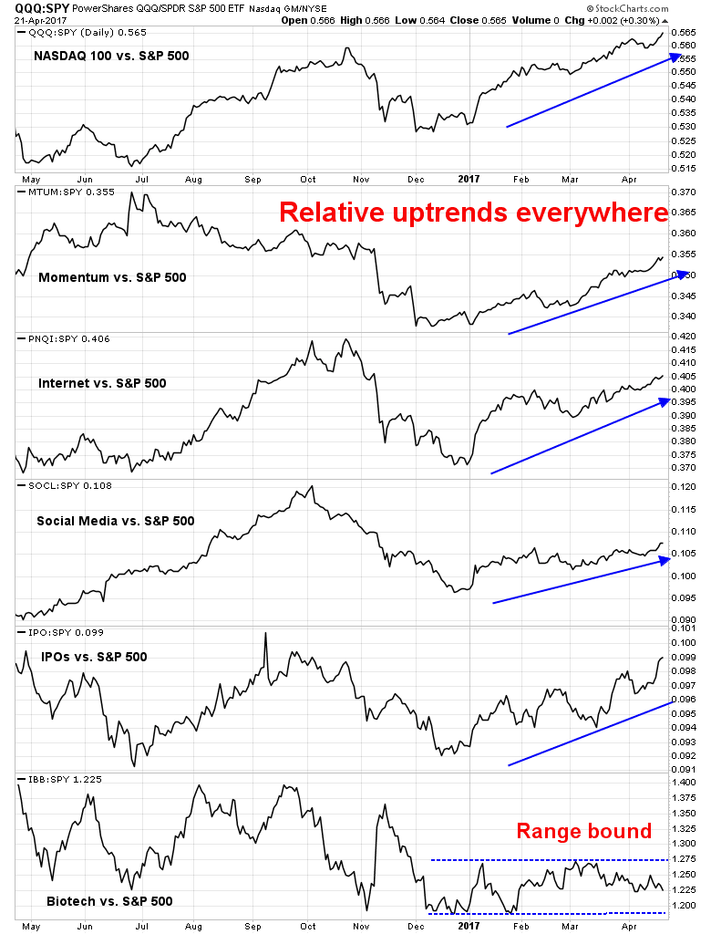 Technology was another surprising leadership sector, especially in light of the pattern exhibited by the other sectors in a market cycle analytical framework. As the chart below shows, enthusiasm for high beta FANG and FANG-like stocks are rising again, except for biotech stocks.