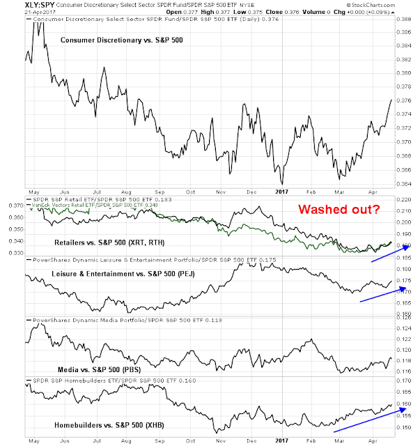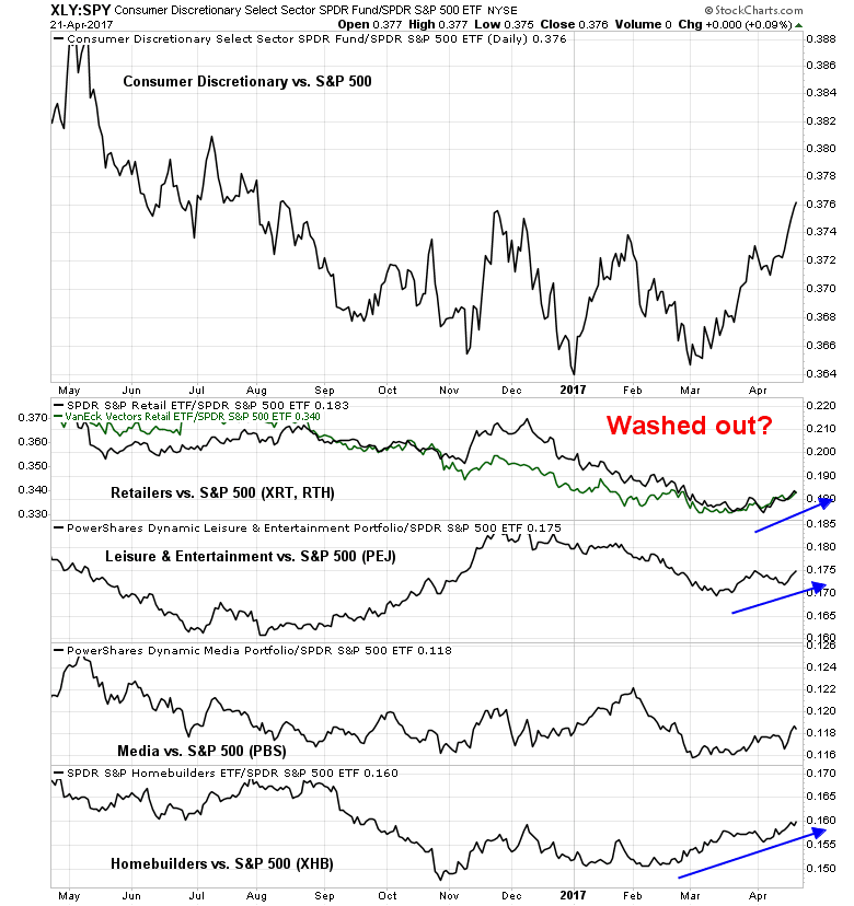 The emergence of Consumer Discretionary stocks as a leadership sector was a bit of a surprise. Here are the relative performance charts of selected industries within the sector. Most of the industries within the sector, with the exception of Media, are starting to turn around. Even the much maligned Retailers look washed out and they are starting to bottom.