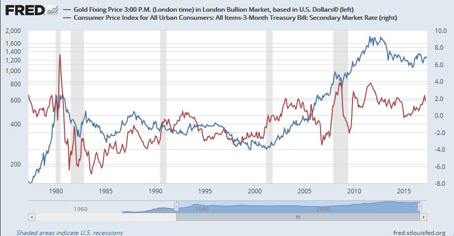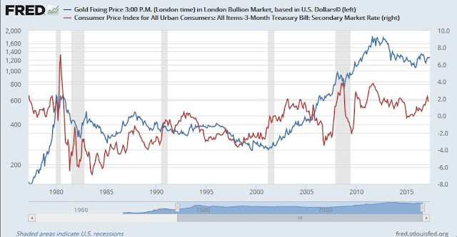 Indeed, the historical record shows that gold prices (blue lines) are inversely correlated with real interest rates (red line, inverted scale). Gold is an inflation hedge, and rising real interest rates would tend to depress the price of gold.