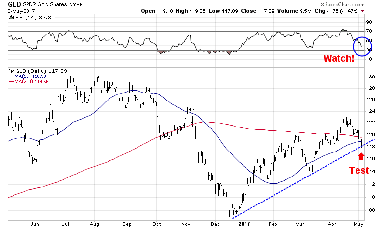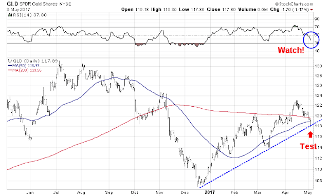 Technically, gold prices may be nearing an inflection point. As the chart below shows, gold violated its 50 and 200 day moving averages (dma) and it is now testing an uptrend line. Further weakness would be bad news for the bulls.
