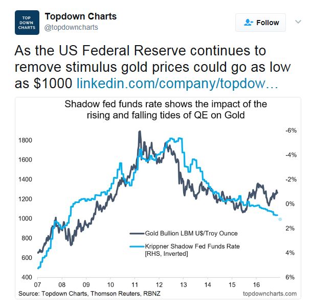 Callum Thomas of Topdown Charts observed that gold prices tend to be inversely correlated with the shadow Fed Funds rate. The Fed continuing tightening cycle should be bearish for gold.