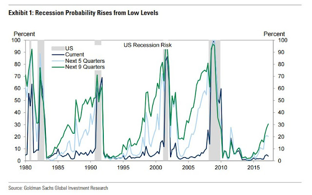Jan Hatzius at Goldman Sachs recently indicated that their models show US recession risk is rising, but readings are not at danger levels. That sounds about right. My own Recession Watch indicators show that risk is rising, but there is no slowdown in sight. Should the Fed continue on its tightening path, however, it would be no surprise to see risk levels significantly higher six months from now. The economic outlook would further deteriorate should Yellen and Fischer be replaced by Trump nominees, who are likely to be even more hawkish.