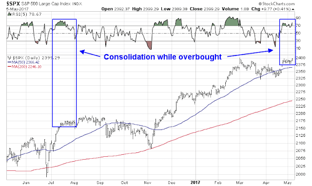 My inner investor is constructive on stocks and he remains overweight equities. My inner trader took profits on his long positions on Friday. Even though the trading model flashed a sell signal, he did not go short. He preferred to adopt a wait and see attitude and wait for a break of the SPX trading range before making a commitment.