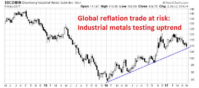 The cyclically sensitive industrial metals are faring better than the CRB Index, which is heavily weighted in the energy complex. Even then, industrial metals have weakened this year to test a key uptrend line, which is raising doubts about the global reflation scenario.
