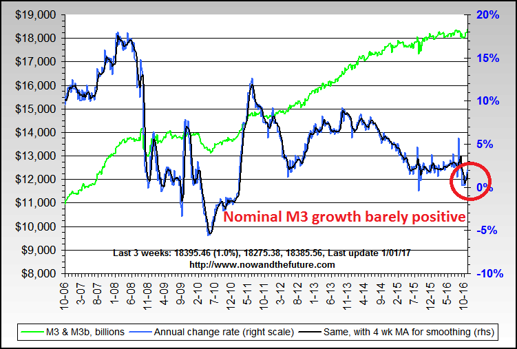 The Federal Reserve stopped publishing an M3 money supply series in 2006. However, Now and Futures has reconstructed an M3 estimate. The latest reading of nominal M3 growth as of January 1, 2017 shows YoY M3 growth to be barely positive. Once we subtract an inflation adjustment, real M3 growth would be either negative or very close to negative – which is a recessionary red flag.