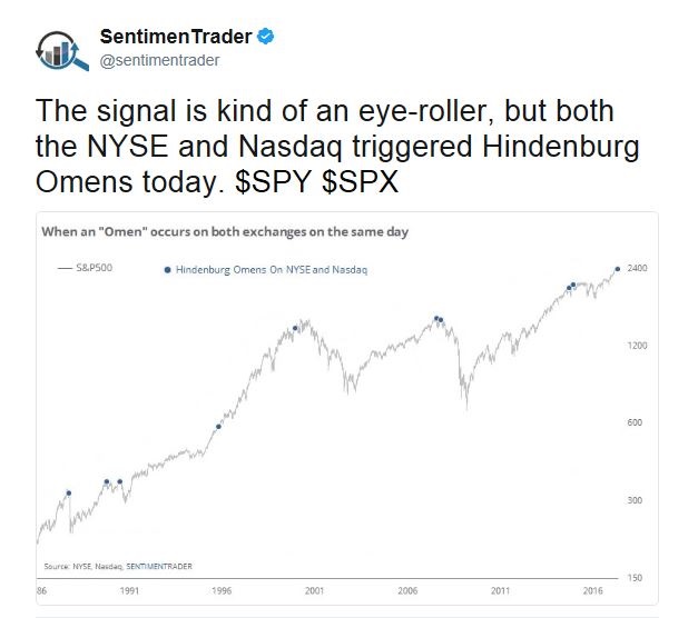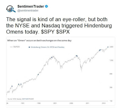 At a tactical level, Sentiment Trader observed that the market flashed a dual Hindenburg Omen for both the NYSE and NASDAQ on Thursday, which is a short-term cautionary signal for the stock market.