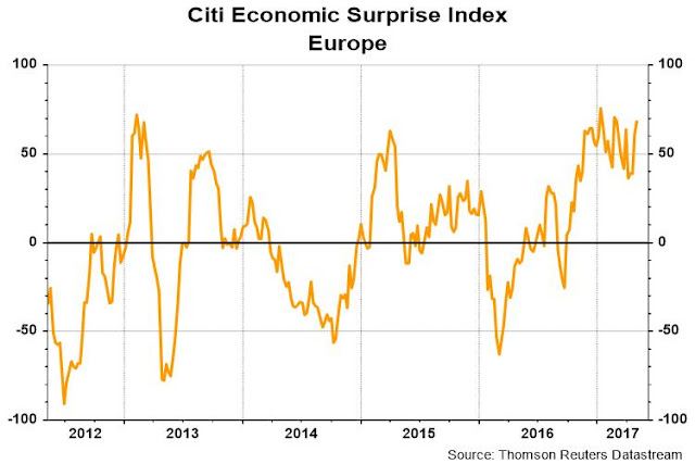 The latest revival is attributable to two factors. The first is cyclical. The European Economic Surprise Index surged in late 2016 and readings remain elevated, indicating that macro-economic releases are coming in well ahead of expectations.