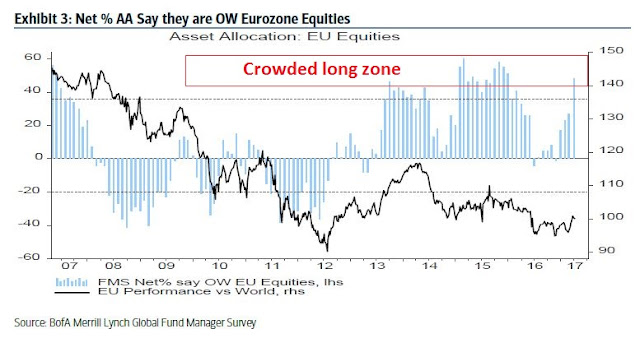 Investment expectations are already high. The latest BAML Fund Manager Survey shows that institutional managers are in a crowded long in eurozone equities. Any political disappointment will see these stocks resume their downward slide against their US counterparts.