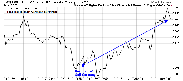 I suggested at the time to buy France and sell Germany as a pairs trade. That trade has certainly worked out well. Now that Emmanuel Macron is destined to be the President of France, and Angela Merkel is the front runner to win another term as German Chancellor, challenges lie ahead for French-German cooperation in the eurozone. Macron has voiced his objective of greater European integration as part of his electoral platform, the question is, “How much integration is Germany willing to accept?”