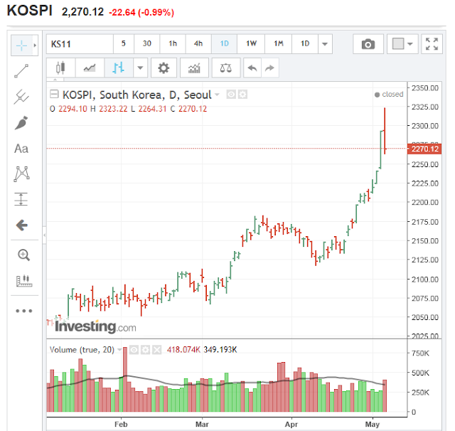 As well, I wrote on April 17, 2017 that the US had few good options in dealing with North Korea (see The Art of the Deal, North Korean edition). Now a further political development is certain to cause both Trump and the American foreign policy establishment headaches, namely the election of Moon Jae In as the President of South Korea. The South Korean KOSPI Index has rallied in the wake of this electoral result, but the likely loser in any geopolitical settlement engineered by Moon is the United States.