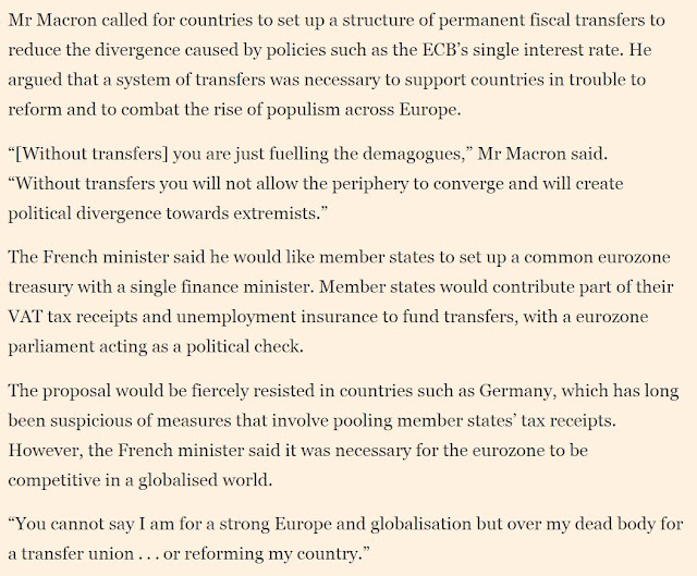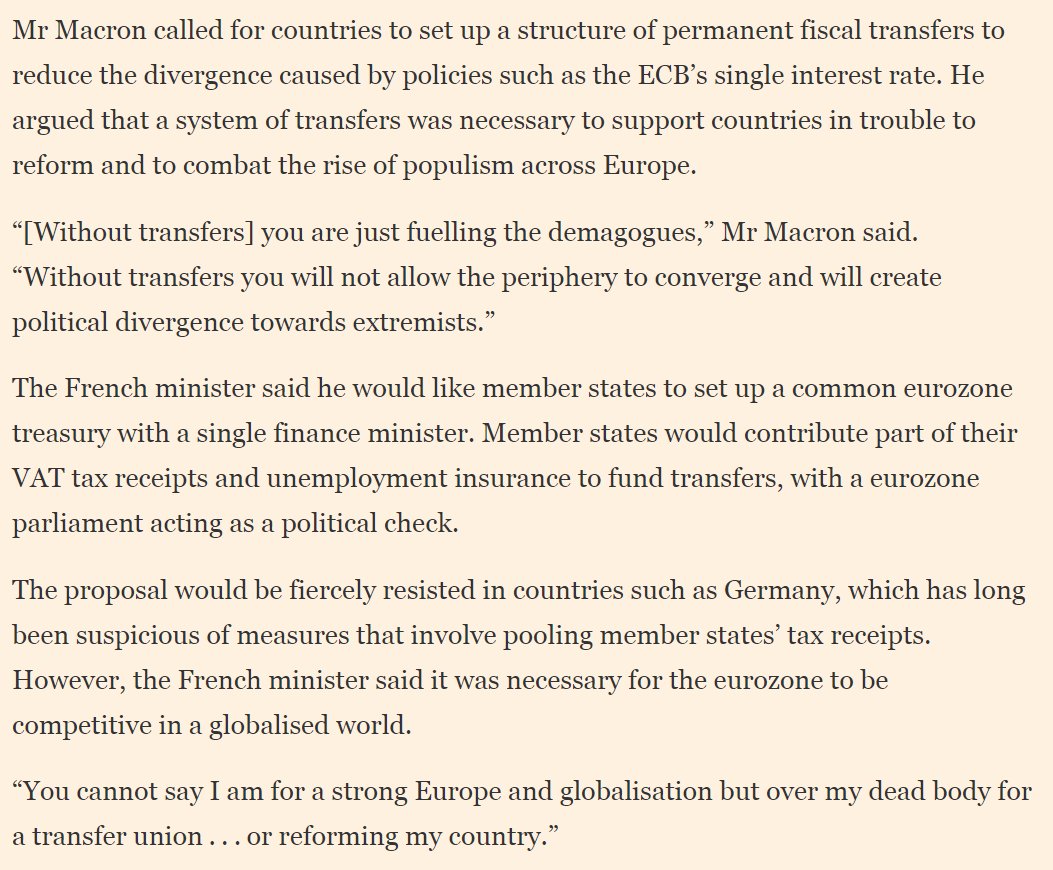 More recently, Emmanuel Macron called for eurozone fiscal transfers in 2015 (via FT):
