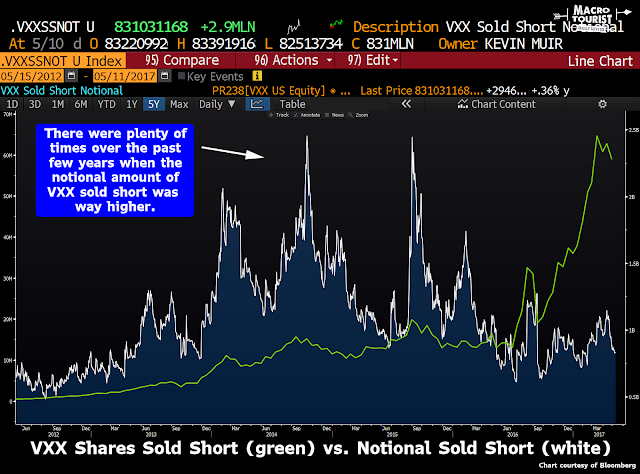 I am aware that these ETF products represent only one portion of the VIX trade. There are futures on VIX, and even more complicated institutional products, like variance swaps. Maybe there is a monster short volatility position out there at the OTC level that I am unaware of. I am not ruling it out.