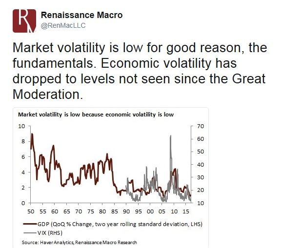 Renaissance Macro recently pointed out that equity vol is low because of low economic volatility.