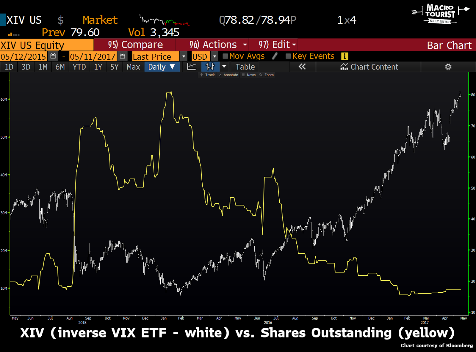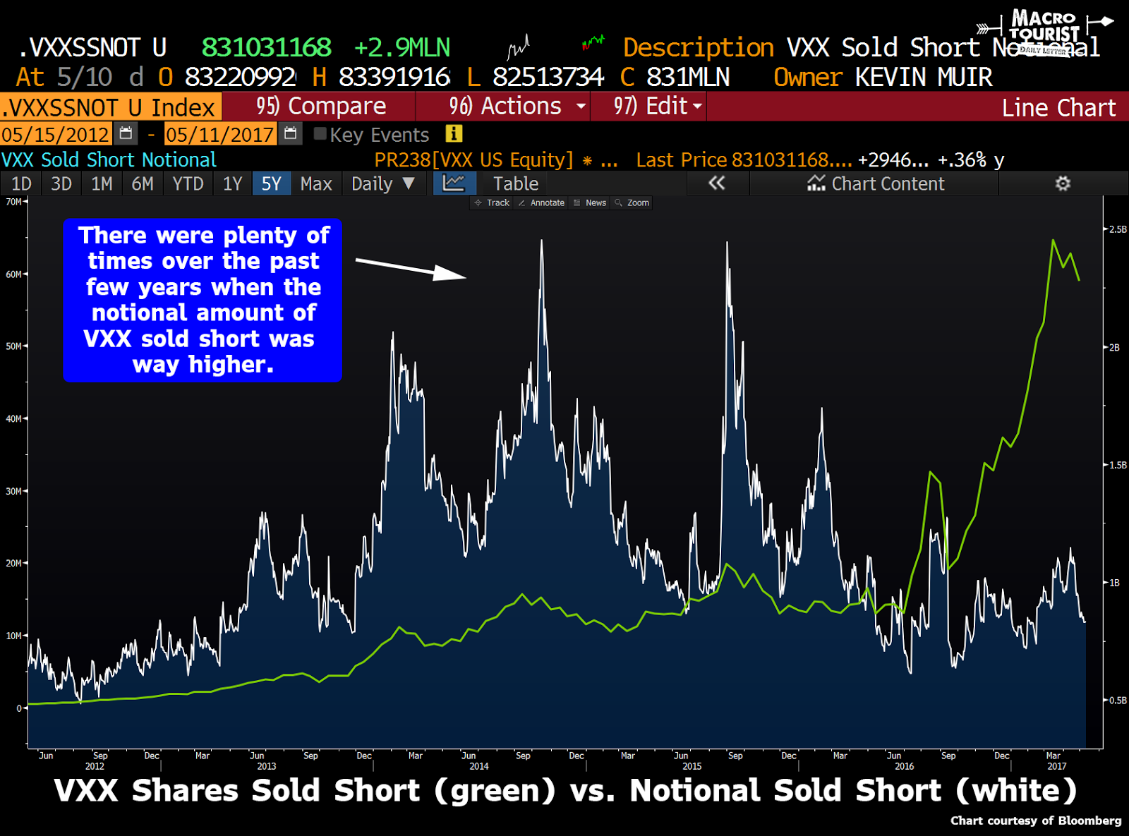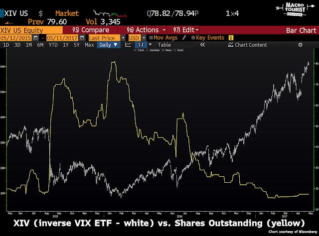 I am aware that these ETF products represent only one portion of the VIX trade. There are futures on VIX, and even more complicated institutional products, like variance swaps. Maybe there is a monster short volatility position out there at the OTC level that I am unaware of. I am not ruling it out.