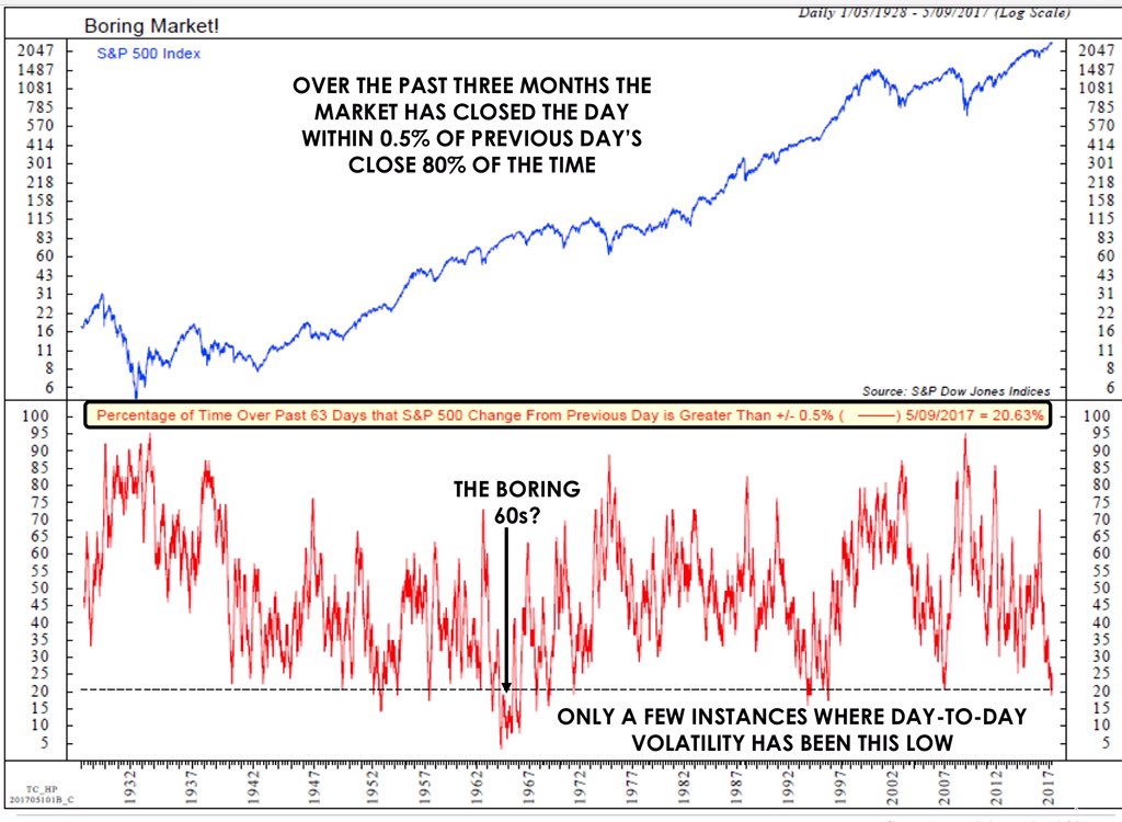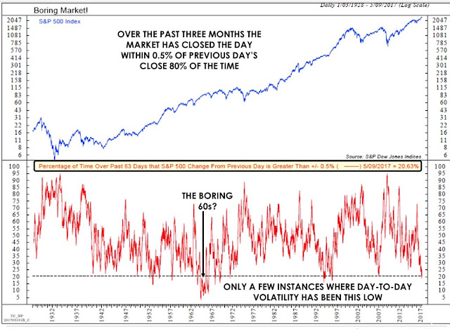 Should investors and traders be worried about the low VIX? Not necessarily. Bill Luby, who is the master of vol analysis at VIX and More, showed that low and high volatility regimes tend to cluster together: