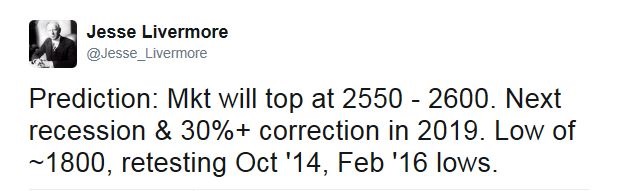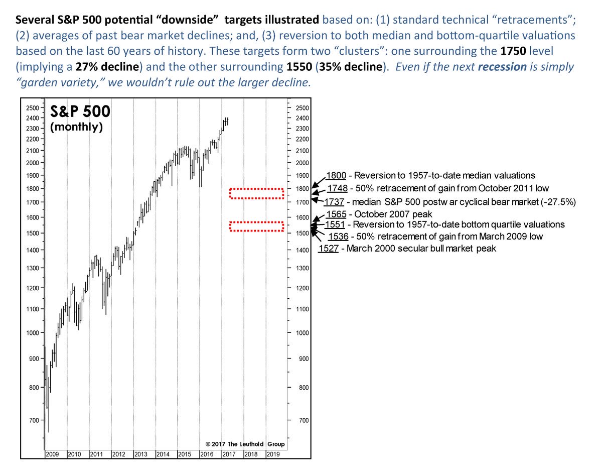 I will make two points, one of which I believe I have made before. The 2550 target is 5.6% higher than current levels. A subsequent decline of 30% from the 2550 level brings us to 1785, which is 26% below current prices. So buy and hold investors are risking 26% to make 5.6% (7.6%ish with dividends). Obviously, different people have different time horizons and risk profiles, and if one is nimble one can capture the 5.6% upside and avoid, and maybe even profit from, the subsequent 30% downside. However, for the classic buy and hold investor the trade-off is a bit one-sided, and not in the good way.
