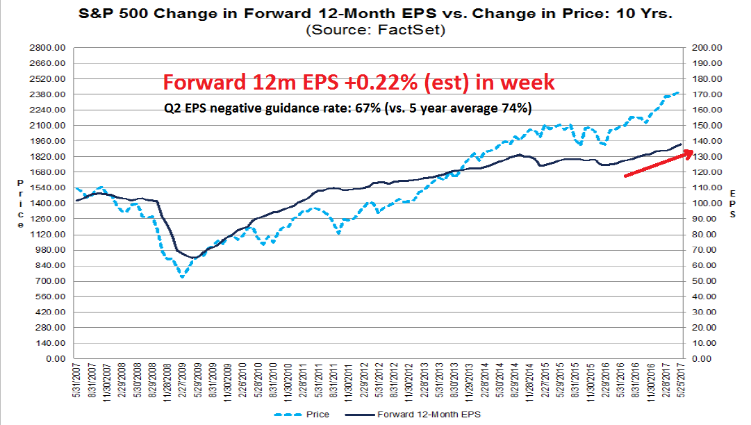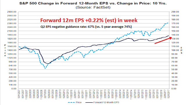 For now, the risk of a major near-term downdraft in equity prices is low. The latest update from FactSet shows that forward 12-month EPS estimates are rising, and Q2 earnings guidance is upbeat by historical standards.