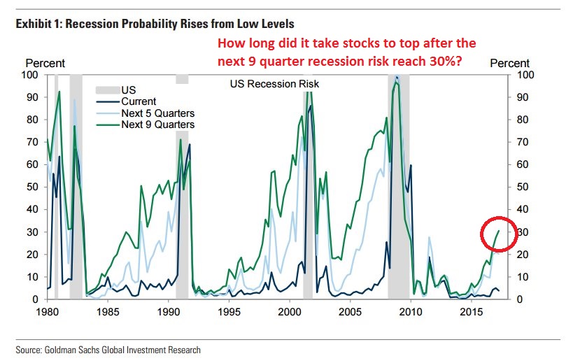 I believe that those questions could be answered in a number of ways. Consider this chart from Jan Hatzius of Goldman Sachs that I showed several weeks ago (see Are the Fed and PBoC taking away the punch bowl?). One reasonable approach might be, “Since major bear market episodes are caused by economic recessions, how far away were previous market tops when the 9 quarter recession risk reached 30%, which is the current reading today?”