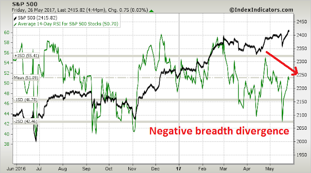 Longer term (1-2 week) breadth indicators is showing disturbing signs of a negative divergence, which is also not good news for the bulls.
