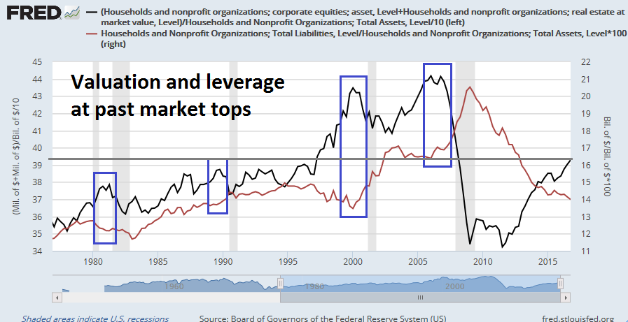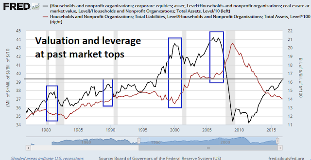 When I turn to the issue of downside risk, the best way to estimate a bear market objective is to see what excesses need to be unwound in the next recession, defined as excess valuation and leverage, which can magnify downside risk as bad debt gets resolved. The chart below shows equity holdings + real estate as a % of total household assets (black line), as a rough guide to asset valuation, and household debt to assets (red line), as a guide to leverage.