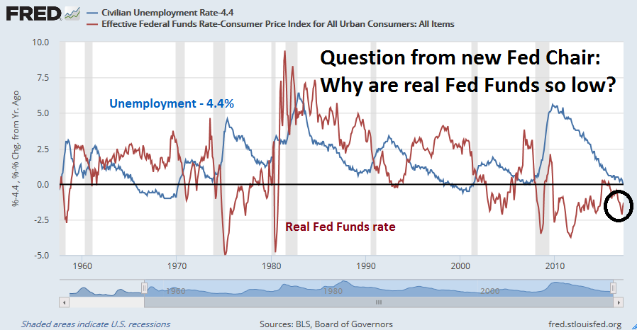 The idea that the Fed would stand idly and allow the economy to continue on its current expansionary course while unemployment is already at 4.4% simply doesn’t pass the sanity test. I have made the case that the main risk to stock prices is tighter monetary policy (see How the bull will die). Arguably, the Yellen Fed has been extremely accommodative by historical standards. Imagine a new Fed chair taking over next year and asking the following uncomfortable question, “Unemployment is already very low by historical standards, why are real Fed Funds so low?”