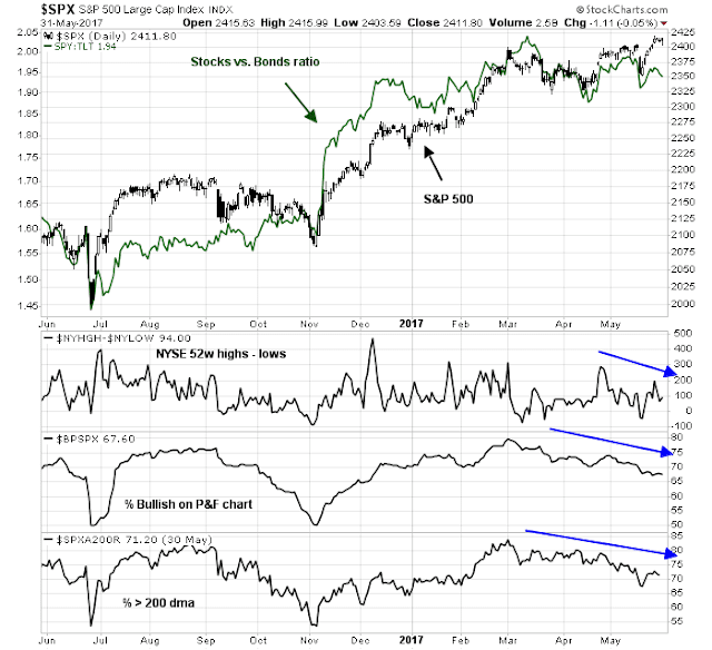 A number of tactically bearish factors are becoming evident for the US equity market. The first is the appearance of a number of negative breadth divergences. As the chart below shows, the SPX has been rallying despite downtrends in net new highs-lows (second panel), % bullish (third panel), and % above 200 dma (bottom panel). In addition, the stock bond ratio (green line, top panel), which is a measure of risk appetite, is also exhibiting a negative divergence.