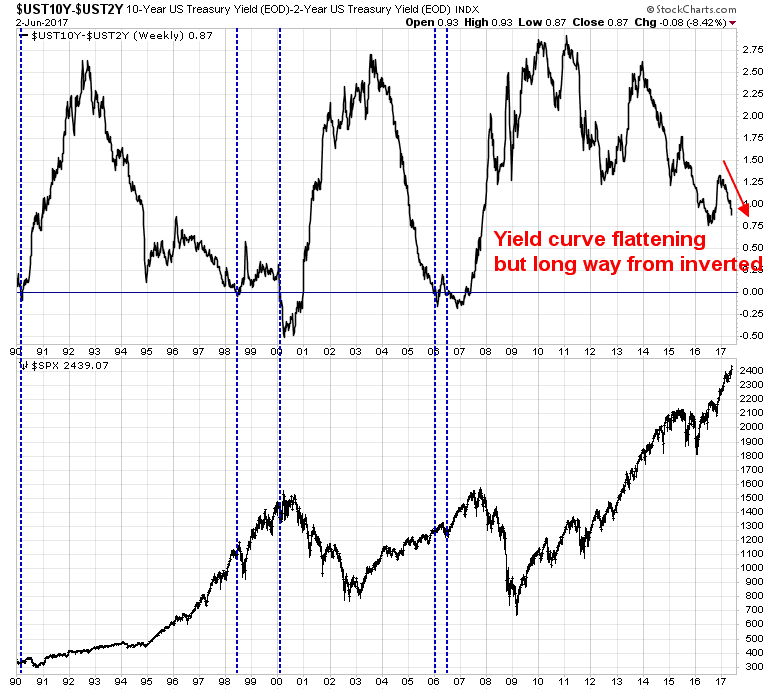 Cam has suggested we are likely to be within say a 12-18 months give or take to a peak. Perhaps we are within 10% of a stock market peak as well. Corporate profits as a percentage GDP is running close to an all time peak. Margin debt is at an all time peak as well (https://www.advisorperspectives.com/dshort/updates/2017/05/31/a-look-at-nyse-margin-debt-and-the-market). Unemployment rate is at an all time low at 4.6% (U6). Total unemployed in the US is around 22% give or take (https://fred.stlouisfed.org/series/LNS13025703). Of course, we will not talk about the latter (22%) in this post. We are in the ninth year of an equity bull market which is one of the longer bull markets.