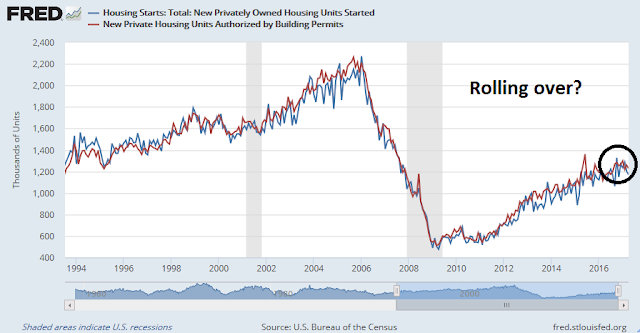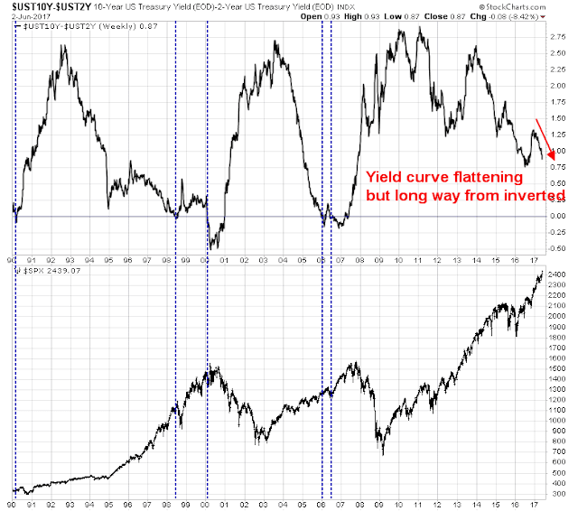 Another warning sign comes from housing, which is a highly cyclical component of the economy and a key long leading indicator. This sector may have peaked for this cycle. Both housing starts (blue line) and housing permits (red line) are showing signs of rolling over. To be sure, both of these data series are very noisy and can be weather dependent. As well, the May Jobs Report showed that construction jobs +11K m/m and +191K y/y, so there is no need to panic just yet.