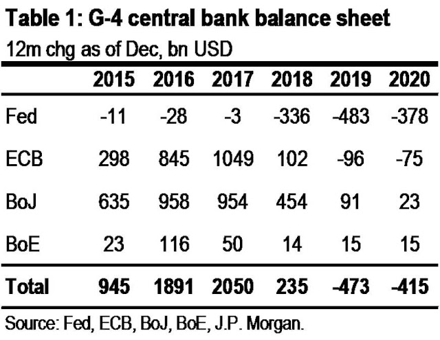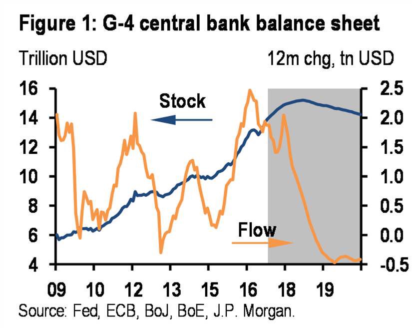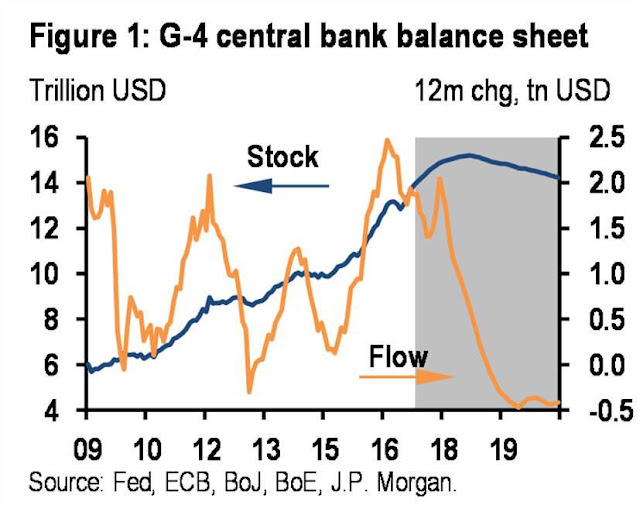 Here are the key risks to stock prices. Looking into 2018 and beyond, the global monetary policy environment is likely to be far less stimulative than it is today. This chart from JP Morgan shows how the balance sheets of G-4 central banks are likely to peak out next year and begin to shrink in 2019 as QE programs reverse themselves.