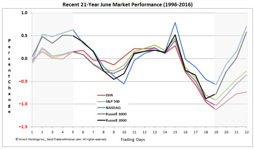 Mid-week market update: So far, the stock market seems to be following Jeff Hirsch’s seasonal map of June. The market was strong in the first couple of days, and it has mostly been flat this week. If history is any guide, it should start to weaken late this week.