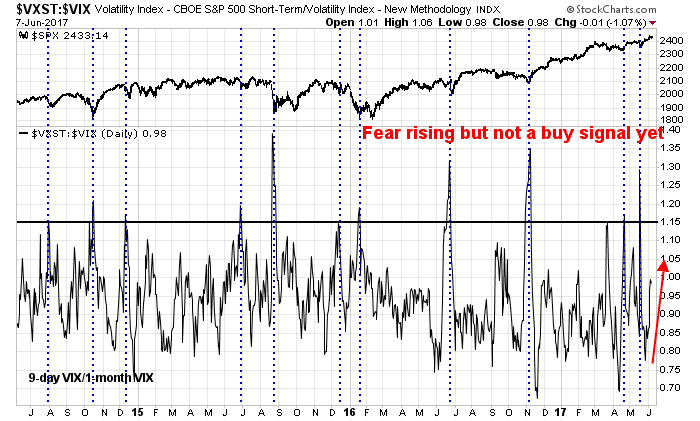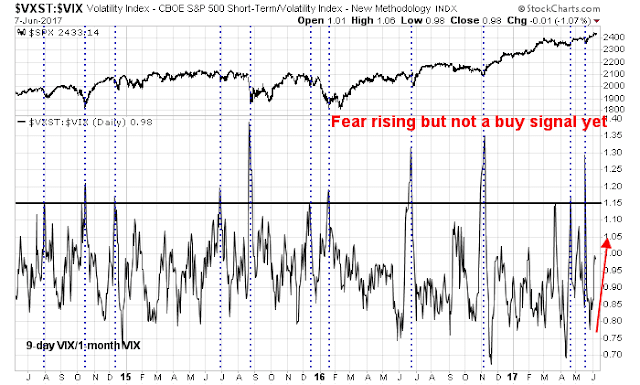 Evidence is building that of a volatility spike ahead. As volatility is inversely correlated with stock prices, rising vol therefore implies a stock market pullback. The chart below of the ratio 9-day VIX (VXST) to 1-month VIX (VIX) shows that anxiety is rising, but levels are nowhere near where past corrections have bottomed in the past.