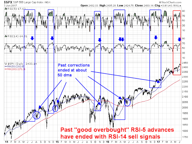 The chart below of the SPX shows that stock prices had recently an episode where the market rallies on a series of “good overbought” reading on RSI-5 (top panel). These “good overbought” signals have been bullish and can continue for some time. However, market advances have stalled when RSI-14 (second panel) pulled back to neutral from an overbought reading, which happened on Monday.