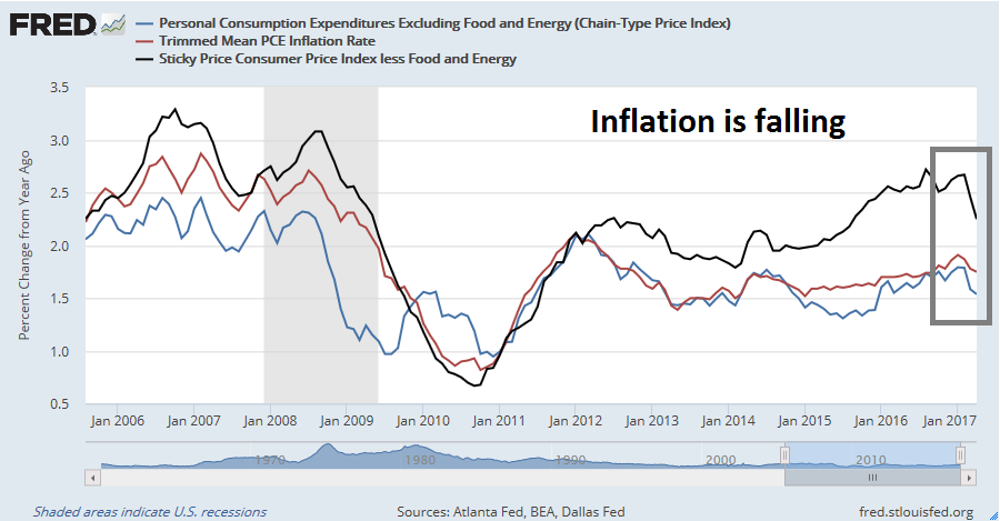 For now, evidence of falling inflation is likely to be ignored. As Fed watcher Tim Duy pointed out, “The Fed’s focus remains on the labor market. Hence, they remain focused on two rate hikes and balance sheet action still to come this year.”