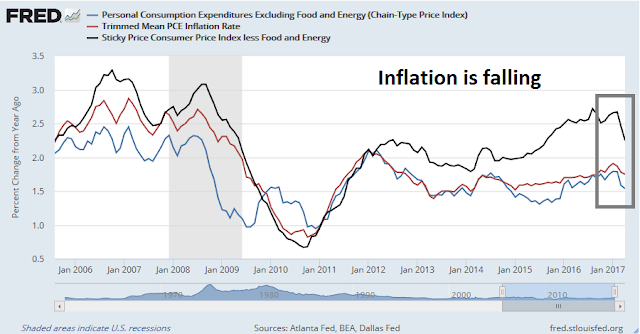 Here is how the employment picture looks like right now. Unemployment (black line) has fallen to the historically low level of 4.3%, while median nominal real earnings (blue line, quarterly data) has been accelerating, and the more timely average hourly earnings (red line, monthly data) has softened.