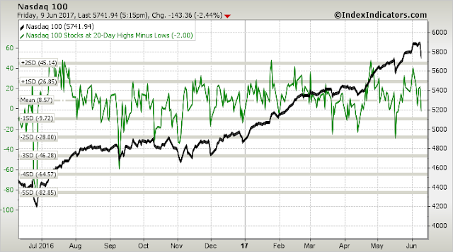 Short-term breadth charts from Index Indicators show that NASDAQ stocks to be oversold (though oversold markets can get more oversold).