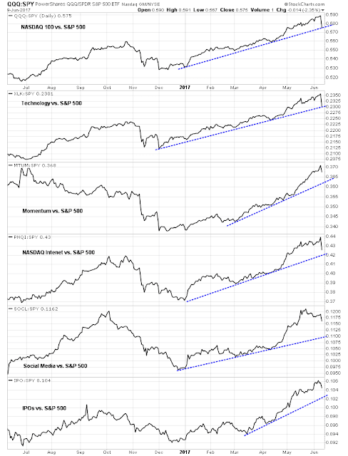 It is unclear whether the downside break is a correction in an uptrend, the start of a correction, or just a sector rotation featuring a sideways consolidation of the other major averages. The weakness was evident in all Technology and high-beta momentum stocks. However, the relative uptrends of these groups all remain intact, though the NASDAQ 100 and Technology groups retreated to test their trend lines.