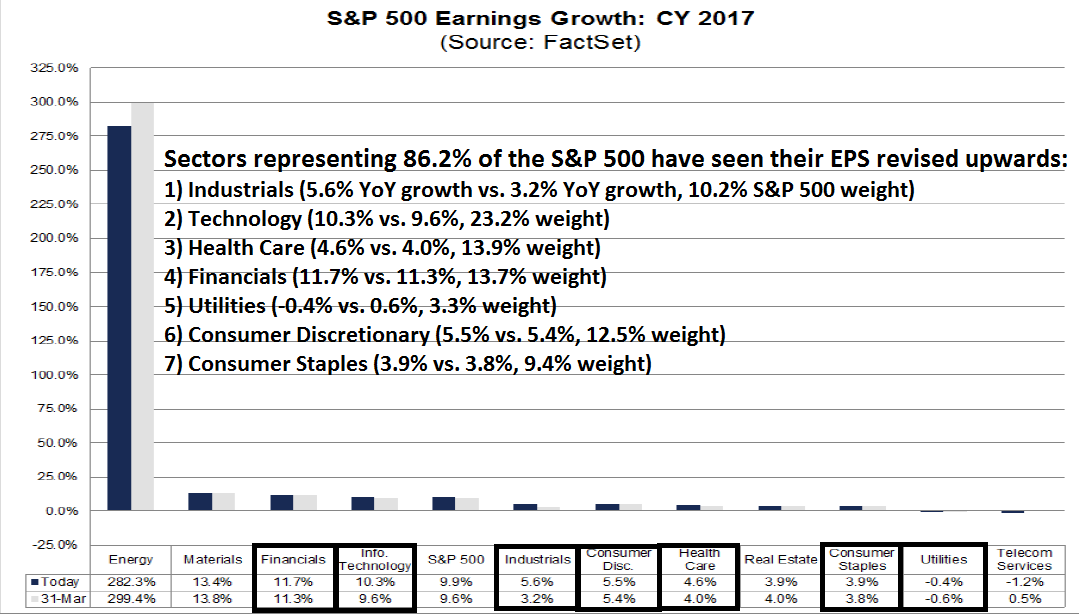 As Ed Clissold indicated in his analysis, 4Q EPS estimates bucked the historical trend by rising instead of falling. This chart from FactSet shows that the upward revisions in 2017 EPS from March to today have been broad based, and represent seven sectors with 86.2% of index weight. (Note that while the Energy sector is projected to have the greatest YoY growth, they were revised downwards).