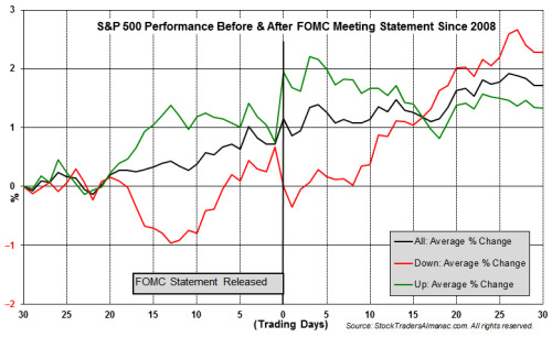 Mid-week market update: I am writing my mid-week market update one day early. FOMC announcement days can be volatile and it’s virtually impossible to make many comments about the technical condition of the market as directional reversals are common the next day. Mark Hulbert suggested to wait 30 minutes after the FOMC announcement, and then bet on the opposite direction of the reaction. For what it’s worth, Historical studies from Jeff Hirsch of Almanac Trader indicated that FOMC announcement days has shown a bullish bias and the day after a bearish one.