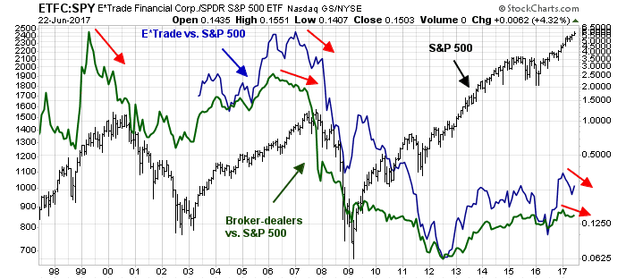 Rather than just focus a single stock, the chart below shows the relative performance of ETFC against the market and the Broker-Dealer ETF (IAI) against the market. Both relative performance ratios topped out before the last two major market peaks.