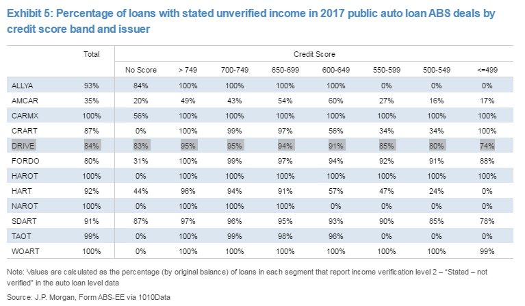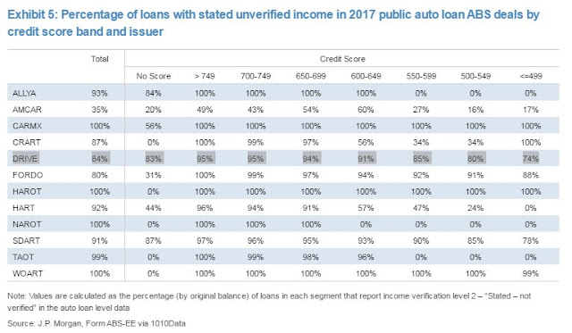 Here is another sign that investors are stretching to get more yield, JP Morgan observed that Santader Consumer USA priced a deep subprime auto loans ABS deal where 84% of the loans are to borrowers with unverified income (via Tracy Alloway).