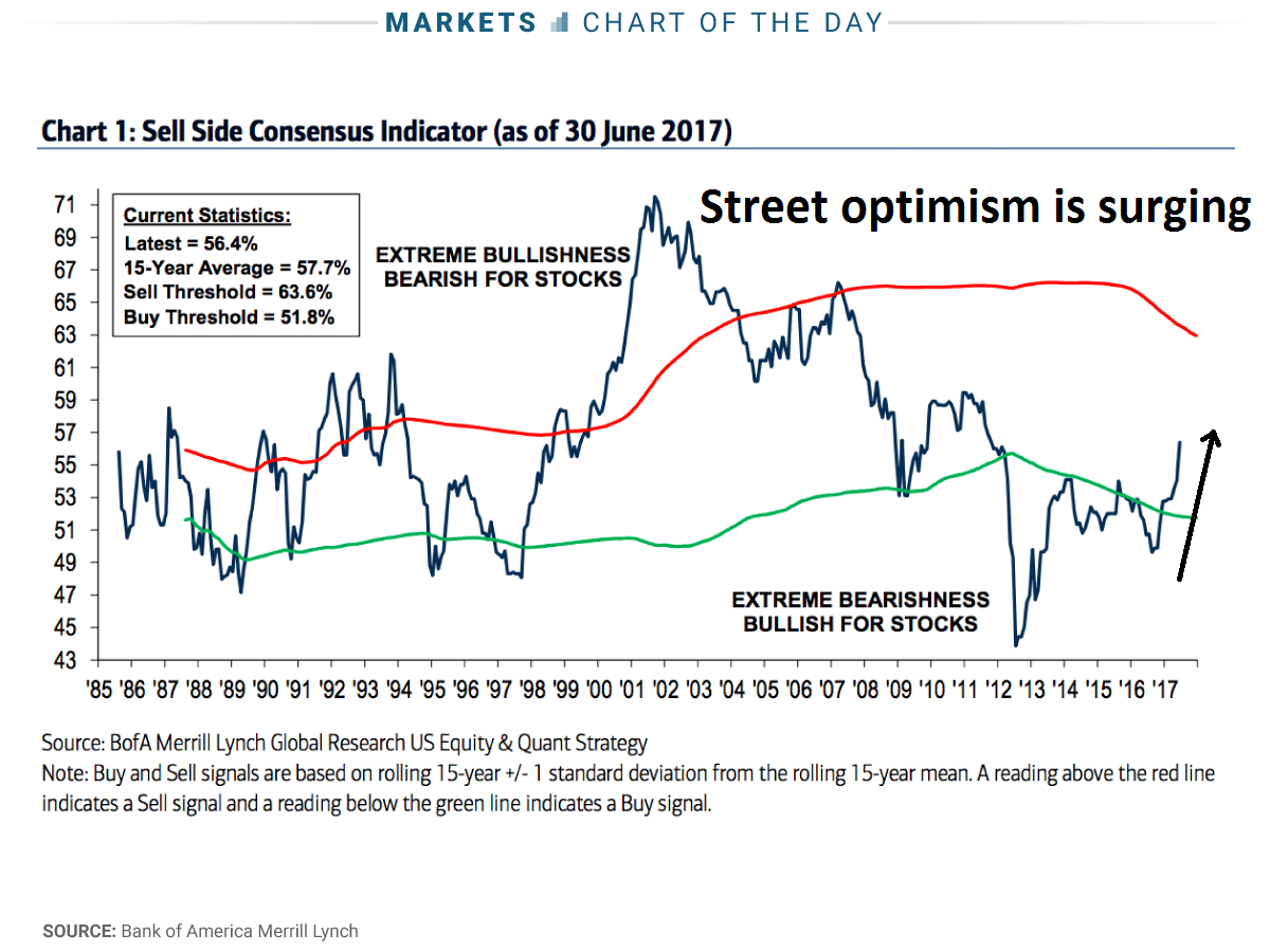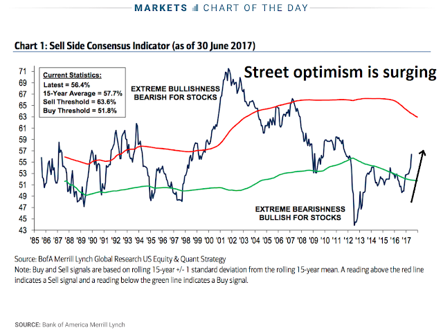 In addition, the BAML Sell Side Indicator, which measures the asset allocation of Street strategists, has proven to be a good contrarian indicator. Currently, Street bullishness is surging, and BAML strategist Savita Subramanian wrote, “The recent inflection from skepticism to optimism could be the first step toward the market euphoria that we typically see at the end of bull markets and that has been glaringly absent so far in the cycle.”