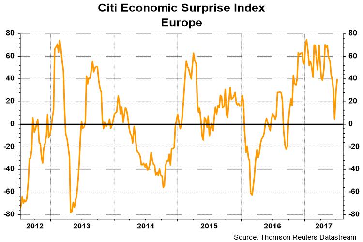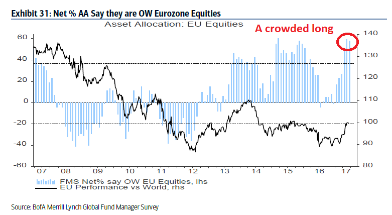 Investor sentiment is at crowded long levels, so expectations are high. The June 2017 BAML Fund Manager Survey shows institutions at a crowded long in eurozone equities.
