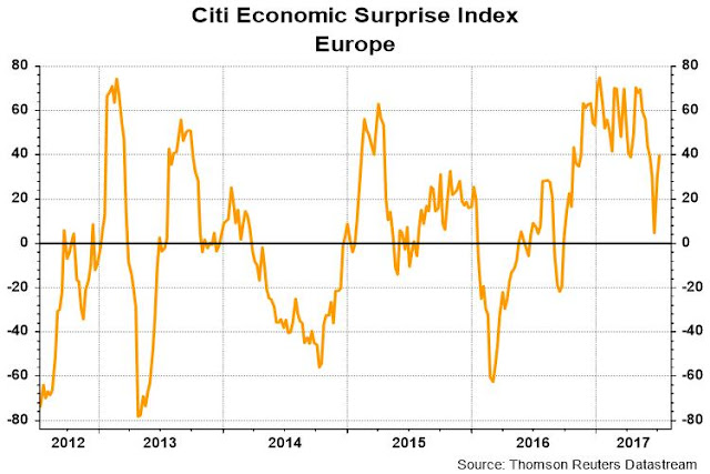 From an economic news perspective, the Citigroup Eurozone Economic Surprise Index is already at elevated levels. With bullish sentiment already elevated, the risk/reward ratio of upside to downside surprises is not favorable.