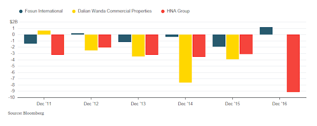 Chinese insurance conglomerates have been going on a shopping spree for overseas assets. One worrisome aspect of these deals is a pattern of the lack of positive free cash flow by acquiring companies, indicating that purchases have to funded by ever growing levels of debt from the banking system.