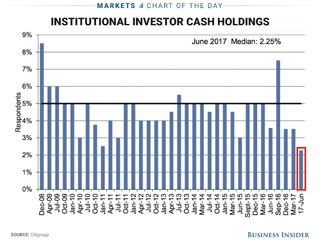 Despite my series on investor sentiment, Things you don’t see at see at market bottoms (which had four editions that were published 13-Jul-2017, 7-Jul-2017, 29-Jun-2017, and 23-Jun-2017), market psychology has not reached the “OMG I have to quit my job/mortgage the house to buy/trade the hot asset of the day”. While there are some excesses, such low levels of institutional cash (chart via Business Insider), the lack of over-the-top froth suggests that the next stock market downturn from a recession may be relatively mild in the manner of a 10-20% decline seen in the 1990 bear market.